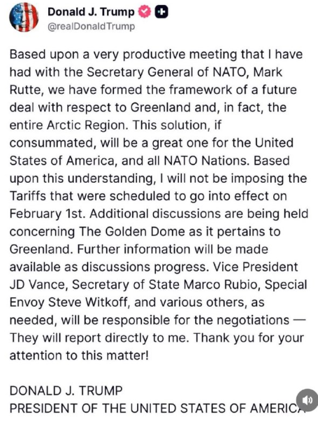 NATO事務総長マーク・ルッテ氏との非常に有意義な会談に基づき、グリーンランド、そして北極圏全体に関する将来の合意の枠組みを策定しました。この解決策が実現すれば、アメリカ合衆国とすべてのNATO加盟国にとって大きな成果となるでしょう。この理解に基づき、2月1日に発効予定だった関税は発動しません。グリーンランドに関連する「ゴールデン・ドーム」については、現在追加協議が行われています。協議の進展に伴い、より詳しい情報が提供されます。J・D・ヴァンス副大統領、マルコ・ルビオ国務長官、スティーブ・ウィトコフ特使、そして必要に応じてその他関係者が交渉を担当し、私に直接報告します。この件にご尽力いただき、ありがとうございます。