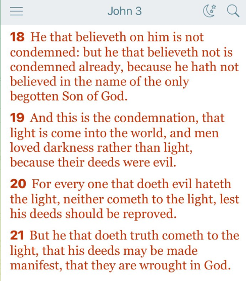 21 しかし、真理を行う者は光に来ます。それは、その行いが神にあってなされたことが明らかになるためです。