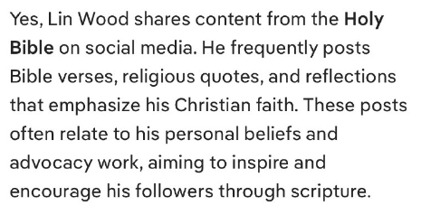 はい、リン・ウッドはソーシャルメディアで聖書のコンテンツをシェアしています。彼は頻繁に、キリスト教の信仰を強調する聖書の一節、宗教的な引用、そして考察を投稿しています。これらの投稿は、彼の個人的な信念や擁護活動に関連することが多く、聖書を通してフォロワーを鼓舞し、励ますことを目指しています。