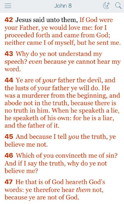 46節 あなたがたのうち、だれがわたしに罪があると認めますか。わたしが真実を語っているのに、なぜわたしを信じないのですか。 47 神から出た者は神の言葉を聞く。