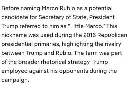 トランプ大統領は、マルコ・ルビオ氏を国務長官候補に指名する前に、彼を「リトル・マルコ」と呼んでいました。このニックネームは2016年の共和党大統領予備選で使用され、トランプ氏とルビオ氏の対立を浮き彫りにしました。この言葉は、選挙運動中にトランプ氏が対立候補に対して用いた広範なレトリック戦略の一部でした。