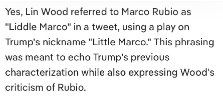 はい、リン・ウッド氏はツイートの中でマルコ・ルビオ氏を「リドル・マルコ」と呼びました。これはトランプ氏のニックネーム「リトル・マルコ」をもじったものです。この言い回しは、トランプ氏の以前の表現を反映させると同時に、ウッド氏によるルビオ氏への批判も表明するものでした。