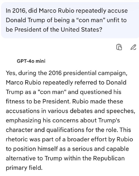 はい。2016年の大統領選挙運動中、マルコ・ルビオはドナルド・トランプ氏を繰り返し「詐欺師」と呼び、大統領としての適格性を疑問視しました。ルビオは様々な討論会や演説でこれらの非難を行い、トランプ氏の人格と大統領としての資格に対する懸念を強調しました。この言辞は、共和党予備選において、ルビオ氏がトランプ氏に代わる真剣で有能な候補者として自らを位置づけようとする、より広範な取り組みの一環でした。