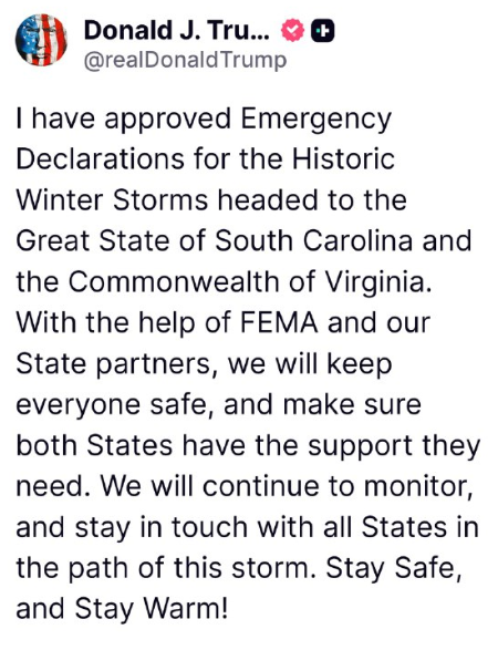 歴史的な冬の嵐がサウスカロライナ州とバージニア州を襲う事態を受け、緊急事態宣言を承認しました。