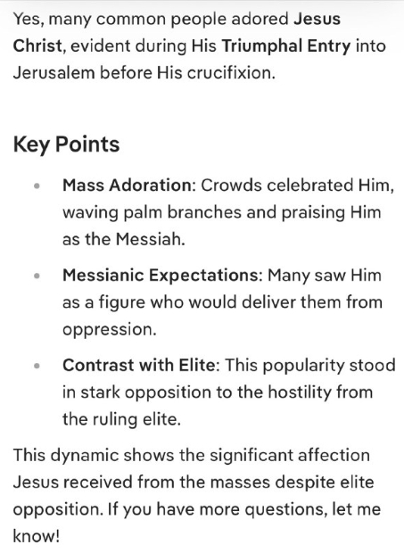 この力学は、エリート層の反対にもかかわらず、イエスが大衆からどれほど大きな愛情を受けていたかを示しています。他にご質問があれば、お知らせください。