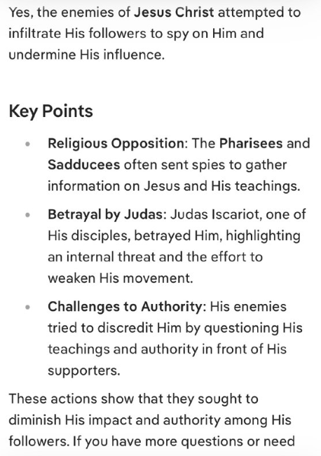 はい、イエス・キリストの敵は、イエスの信奉者たちに潜入し、イエスをスパイし、イエスの影響力を損なうことを試みました。