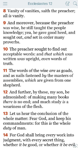 12 さらに、わが子よ、これらのことによって戒められなさい。多くの書物を作ることには終わりがなく、多くの学びは肉体を疲れさせる。