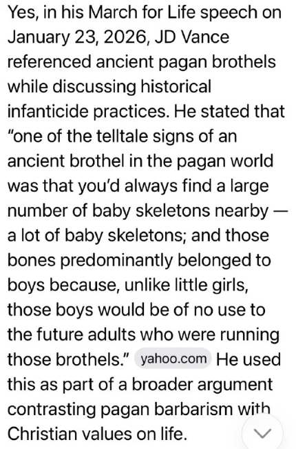 はい、2026年1月23日の「いのちのための行進」演説で、JD・ヴァンスは古代の異教徒の売春宿に言及し、歴史的な幼児殺害の慣習について論じました。彼は、「異教世界における古代の売春宿の明らかな特徴の一つは、常に近くに多数の赤ん坊の骨が見つかることです。本当にたくさんの赤ん坊の骨です。そして、それらの骨は主に男の子のものでした。なぜなら、女の子とは異なり、男の子は売春宿を経営する将来の大人にとって何の役にも立たないからです」と述べました。yahoo.com 彼はこれを、異教徒の野蛮さとキリスト教の生命観を対比させる、より広範な議論の一部として用いました。