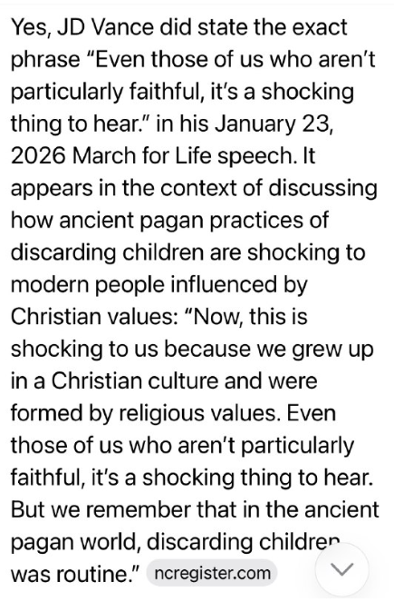 はい、JD・ヴァンスは2026年1月23日の「いのちのための行進」の演説で、「特に信仰深くない者でさえ、これは衝撃的な話だ」と正確に述べています。これは、古代異教における子供を捨てる慣習が、キリスト教の価値観に影響を受けた現代人にとっていかに衝撃的であるかを議論する文脈の中で出てきます。「これは私たちにとって衝撃的なことです。なぜなら、私たちはキリスト教文化の中で育ち、宗教的価値観によって形成されてきたからです。特に信仰深くない者でさえ、これは衝撃的な話です。しかし、古代異教の世界では、子供を捨てることが日常茶飯事だったことを私たちは覚えています。」ncregister.com