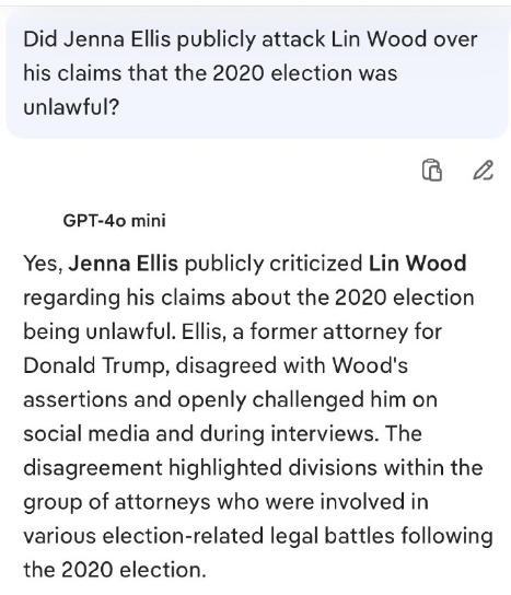 はい、ジェナ・エリスは、2020年の選挙が違法だったというリン・ウッド氏の主張について、公に批判しました。ドナルド・トランプ氏の元弁護士であるエリスは、ウッド氏の主張に反対し、ソーシャルメディアやインタビューで公然と反論しました。この意見の相違は、2020年の選挙後に様々な選挙関連の法廷闘争に関わった弁護士グループ内の分裂を浮き彫りにしました。