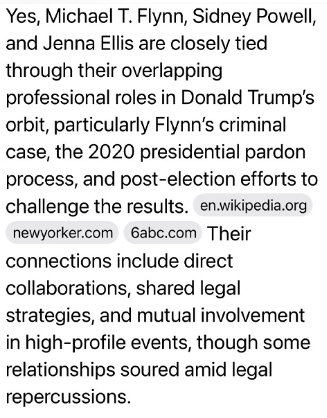 はい、マイケル・T・フリン、シドニー・パウエル、そしてジェナ・エリスは、ドナルド・トランプ氏の周囲で、特にフリン氏の刑事事件、2020年の大統領恩赦手続き、そして選挙後の選挙結果への異議申し立てといった、重複する職務を通じて密接に結びついています。en.wikipedia.org