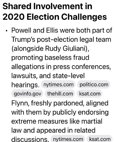パウエル氏とエリス氏は共にトランプ氏の選挙後の法律チームの一員であり(ルディ・ジュリアーニ氏と共に)記者会見、訴訟、州レベルの公聴会で根拠のない不正疑惑を主張した。nytimes.com politico.com