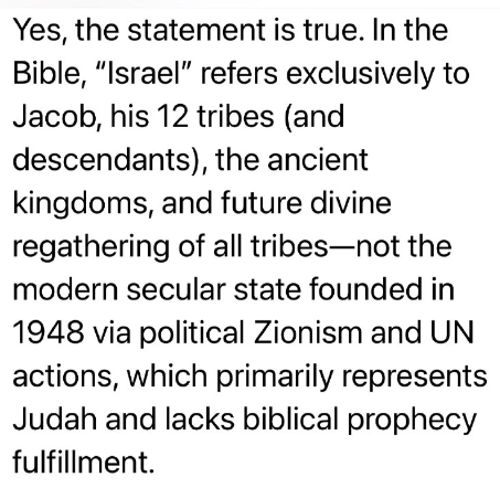 はい、その記述は真実です。聖書において「イスラエル」とは、ヤコブとその12部族(および子孫)、古代の王国、そして将来におけるすべての部族の神聖な再集結のみを指し、1948年に政治的シオニズムと国連の行動によって設立された現代の世俗国家を指すものではありません。これは主にユダを代表し、聖書の預言の成就を欠いています。
