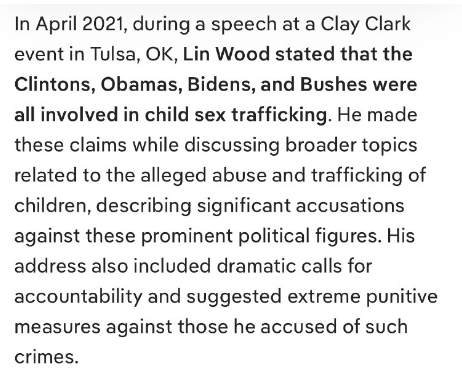 2021年4月、オクラホマ州タルサで開催されたクレイ・クラーク主催のイベントでの講演で、リン・ウッド氏は、クリントン氏、オバマ氏、バイデン氏、ブッシュ氏らが児童性的人身売買に関与していたと述べました。ウッド氏は、児童虐待や人身売買の疑惑に関するより広範な話題について議論する中で、これらの著名な政治家に対する重大な告発について説明しました。また、ウッド氏の演説では、説明責任の追及を強く求め、そのような犯罪で告発された人々に対する厳格な懲罰措置を提案しました。