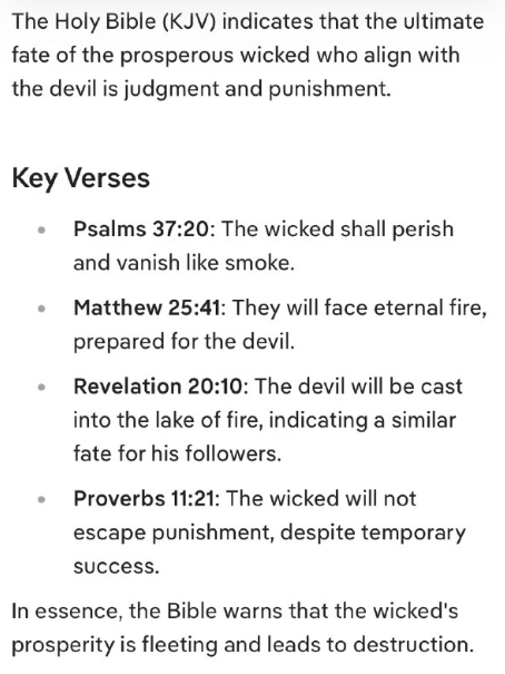 聖書(欽定訳聖書)は、悪魔と結託する裕福な悪人の最終的な運命は、裁きと罰であると示しています。