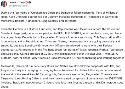 この送還活動は進行中であり、共和党が統治する都市や州では、地方の法執行官が連邦の法執行官と協力できるため、これらの活動は平和的かつ円滑に進んでいます。例えば、共和党が支配するテキサス、ジョージア、フロリダ、テネシー、ルイジアナの5州では、ICE(移民税関捜査局)が過去1年間で15万245人の不法移民犯罪者を逮捕しましたが、抗議活動、暴動、混乱は全く発生していません。なぜでしょうか?それは、地元警察とICEが協力し、連携しているからです。