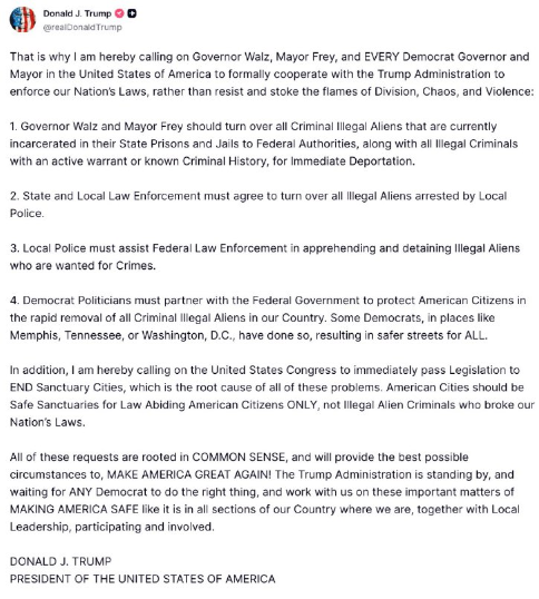 さらに、私はここに米国議会に対し、これらの問題の根本原因であるサンクチュアリ・シティを廃止するための法案を直ちに可決するよう要請します。アメリカの都市は、法を遵守するアメリカ国民のみのための安全なサンクチュアリであるべきであり、国の法律を破った不法移民犯罪者のためのサンクチュアリであってはなりません。