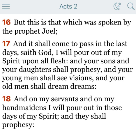 17節 神は言われる。「終わりの日に、わたしはわたしの霊をすべての人に注ぐ。すると、あなたがたの息子、娘は預言し、あなたがたの若者は幻を見、あなたがたの老人は夢を見る。