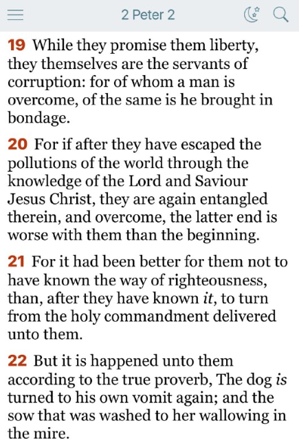 20節 主であり救い主であるイエス・キリストを知ることによって世の汚れから逃れた後、再びそれに巻き込まれ、打ち負かされるなら、彼らの終わりは初めよりも悪いものとなるからです。