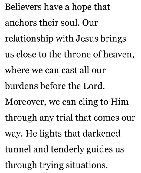 信者には、魂を錨で繋ぐ希望があります。イエス様との関係は、私たちを天の御座に近づけ、すべての重荷を主の前に委ねることができます。さらに、どんな試練が訪れても、主にすがることができます。主は暗いトンネルを照らし、試練の状況を優しく導いてくださいます。