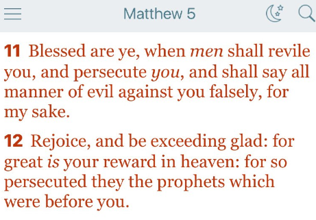 11節 わたしのゆえに、人々があなたがたをののしり、迫害し、あらゆる悪口を偽ってあなたがたに言うとき、あなたがたは幸いです。