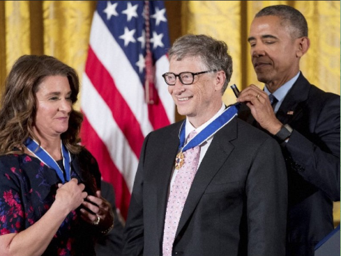 この画像は、ビル・ゲイツとメリンダ・フレンチ・ゲイツがバラク・オバマ大統領から大統領自由勲章を授与されている瞬間を捉えたものです。