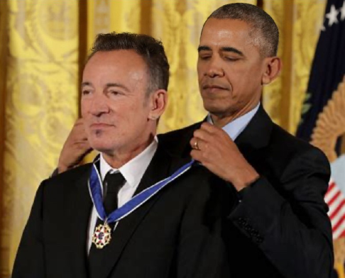 この画像は、2016年11月22日にホワイトハウスで行われた式典で、当時のバラク・オバマ大統領が歌手のブルース・スプリングスティーンにアメリカ最高の文民栄誉である大統領自由勲章を授与している場面です。概要