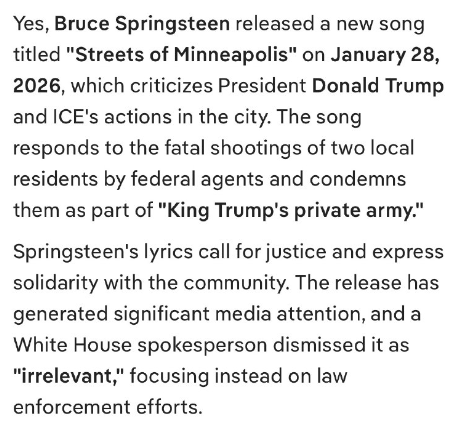 2026年1月17日、ニュージャージー州でライト・オブ・デイ・ウィンターフェストに出演したスプリングスティーンは、その月にミネソタ州で移民関税執行局(ICE)のジョナサン・ロスに殺害されたレニー・グッドに曲「 The Promised Land」を捧げた。[ 338 ] [ 339 ] [ 340 ]この殺害は、ミネソタ州全体でICEの活動が大幅に増加した「オペレーション・メトロ・サージ」の一環として発生した。[ 341 ]コンサートでスプリングスティーンは次のように述べた。「もしあなたが法の力を信じ、誰もそれを超えることはできないと信じるなら、アメリカの都市に侵攻し、ゲシュタポのような戦術を用いる重武装の覆面連邦軍に反対するなら、もしあなたがアメリカ国民の抗議の権利を行使したために殺されるに値しないと信じるなら、市長(ジェイコブ・フライ)が言ったように、大統領にメッセージを送ってください。ICEはミネアポリスから出て行け。」[ 339 ] 2026年1月28日、スプリングスティーンは「ストリーツ・オブ・ミネアポリス」をリリースした。この曲はICEに向けた抗議歌で、ICEを「キング・トランプの私設軍隊」と表現しており、ICE職員によるレネー・グッドとアレックス・プレッティの殺害に直接反応して書かれたものである。[ 342 ]この曲はプレッティ射殺事件の翌日に書かれ、事件のわずか5日後にリリースされた。[ 343 ] 2026年1月30日、スプリングスティーンはトム・モレロのミネアポリスでの慈善コンサート「Defend Minnesota」にサプライズゲストとして登場し、「Streets of Minneapolis」を初めて演奏したほか、モレロと共演して「The Ghost of Tom Joad」を演奏した。コンサートの収益の100%はグッドとプレティの家族に寄付された。[ 344 ] [ 345 ]
