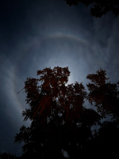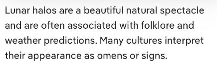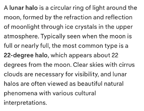 月暈(つきがさ)とは、上層大気の氷晶による月光の屈折と反射によって形成される、月の周囲に現れる円形の光の輪です。通常、満月または満月に近い月に見られ、最も一般的なのは月から約22度の角度で現れる22度暈です。月暈を観測するには、巻雲のある晴天が必要です。月暈は、様々な文化的解釈を持つ美しい自然現象として捉えられることがよくあります。
