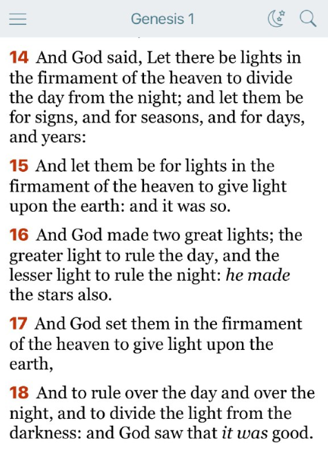 16 神は二つの大きな光を造られた。大きい光は昼をつかさどり、小さい光は夜をつかさどらせ、また星も造られた。