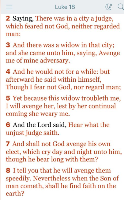 8 あなたがたに言います。神は速やかに彼らの復讐をされます。しかし、人の子が来るとき、地上に信仰を見いだすでしょうか。
