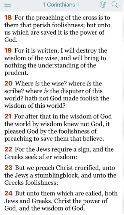 18 十字架の説教は、滅びる者には愚かなものです。しかし、救われる私たちには、神の力です。