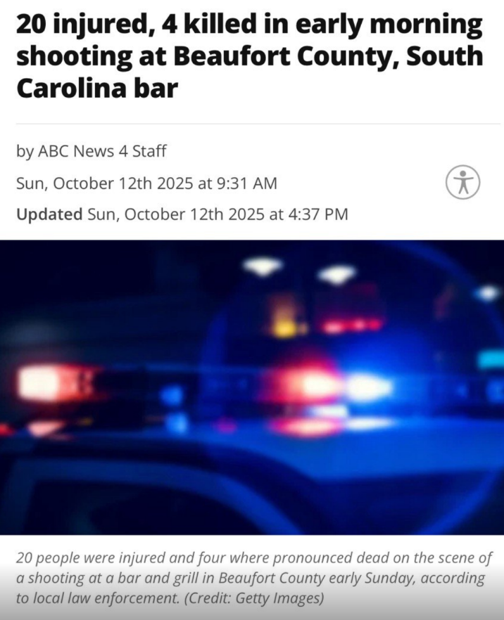 サウスカロライナ州ビューフォート郡のバーで早朝に銃撃事件が発生し、20人負傷、4人死亡