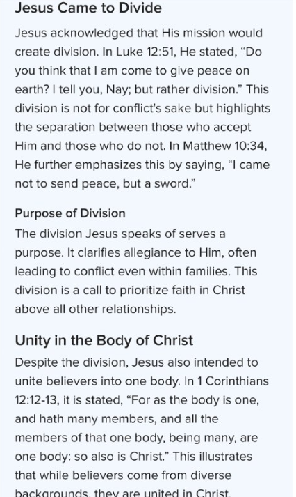 イエスは、ご自身の使命が分裂を生み出すことを認めておられました。ルカによる福音書12章51節で、イエスはこう言われました。「あなたがたは、わたしが地上に平和を与えるために来たと思うのか。いや、そうではない。むしろ分裂をもたらすのだ。」この分裂は争いを目的としたものではなく、イエスを受け入れる者と受け入れない者との間の分裂を浮き彫りにするものです。マタイによる福音書10章34節で、イエスはさらに「わたしは平和を送るために来たのではなく、剣を送るために来たのだ」と強調して言われます。