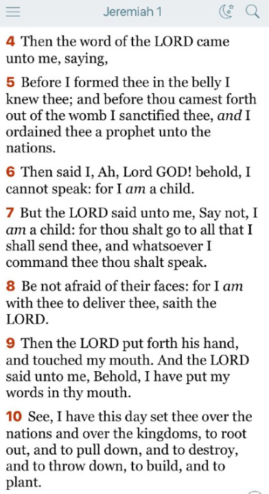 5 わたしは、あなたを母の胎内に形づくる前から、あなたを知り、あなたが胎から出る前から、あなたを聖別し、諸国民の預言者として立てた。