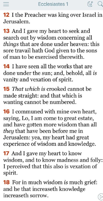 16 わたしは自分の心と語り合って言った。「見よ、わたしは大きな地位に達し、エルサレムでわたしより先にいたすべての人々よりも多くの知恵を得た。まことに、わたしの心は知恵と知識を大いに経験した。」