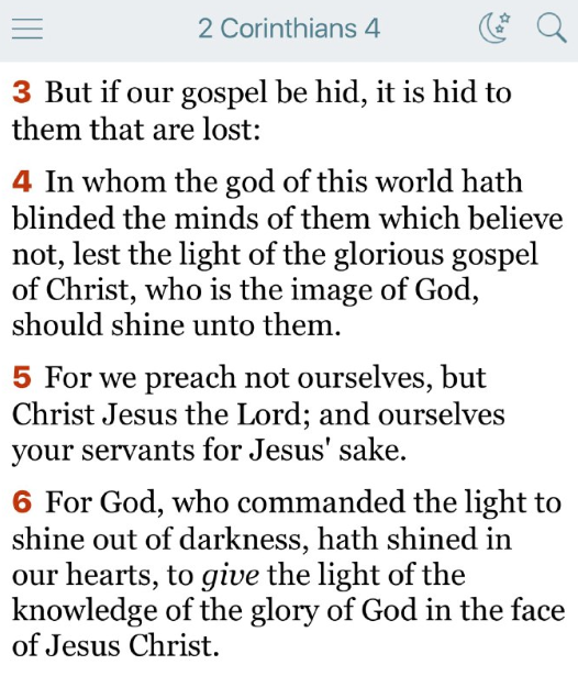 4 この世の神は、信じない者たちの心を暗くし、神のかたちであるキリストの栄光ある福音の光が、彼らに照らされないようにしているのです。