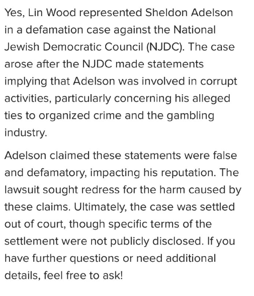 はい、リン・ウッドはシェルドン・アデルソン氏の代理人として、全米ユダヤ民主評議会(NJDC)に対する名誉毀損訴訟を担当しました。この訴訟は、NJDCがアデルソン氏が腐敗行為、特に組織犯罪や賭博業界との関わりを示唆する発言を行った後に発生しました。アデルソン氏は、これらの発言は虚偽であり、名誉を傷つけるものであり、自身の評判に悪影響を与えたと主張しました。この訴訟は、これらの主張によって生じた損害に対する賠償を求めるものでした。最終的に、この訴訟は示談で解決されましたが、和解の具体的な条件は公表されていません。ご質問や詳細が必要な場合は、お気軽にお問い合わせください。