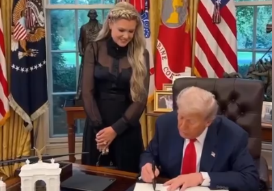 ※エリカ・カークの隣でサインをするトランプ大統領