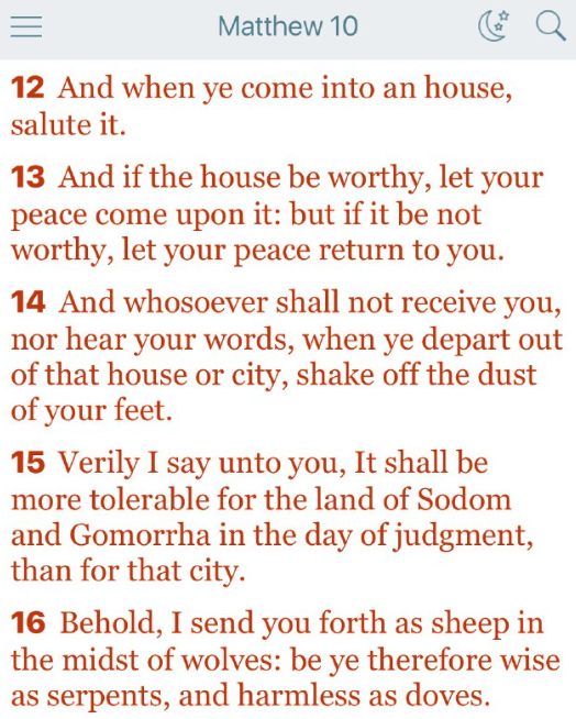 その家や町から出て行くとき、あなたがたの足のちりを払い落としなさい。