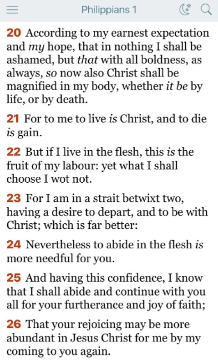 私は切なる願いと希望を抱いています。それは、何事にも恥じることなく、いつものように、今もなお、大胆に、生きるにせよ死ぬにせよ、私の身においてキリストがあがめられることです。
