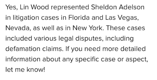 はい、リン・ウッドはシェルドン・アデルソンの代理として、フロリダ州、ネバダ州ラスベガス、そしてニューヨーク州で訴訟案件を担当しました。これらの案件には、名誉毀損訴訟を含む様々な法的紛争が含まれていました。特定の案件や側面についてより詳細な情報が必要な場合は、お知らせください。