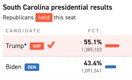 サウスカロライナは、2016年と2020年にトランプが簡単に勝利した州です。