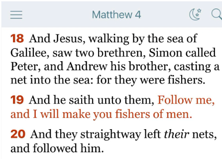 19 イエスは彼らに言われた、「わたしについて来なさい、そうすれば、あなたがたを人を捕る漁師にしよう」。