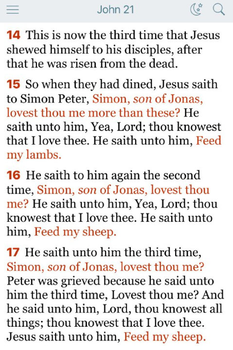 17 イエスは三度目に彼に言われた。「ヨナの子シモンよ、あなたはわたしを愛するか。」ペテロは、イエスが三度目に「私を愛しているか」と言われたので、悲しんだ。