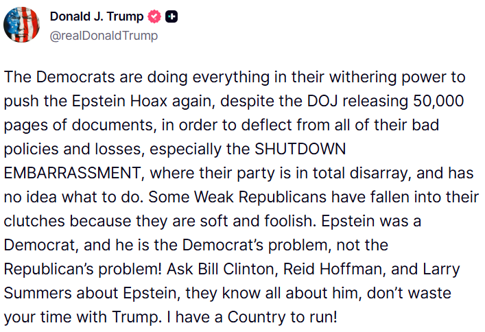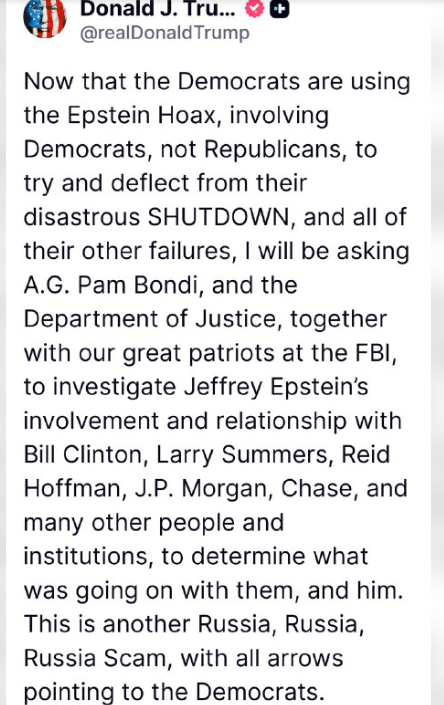 民主党が、共和党ではなく民主党を巻き込んだエプスタイン事件を利用して、破滅的な政府閉鎖やその他の失策を隠そうとしている今、私はパム・ボンディ司法長官と司法省、そしてFBIの偉大な愛国者たちに、ジェフリー・エプスタインとビル・クリントン、ラリー・サマーズ、リード・ホフマン、JPモルガン、チェース、その他多くの人々や機関との関わりと関係を調査し、彼らとエプスタインに何が起こっていたのかを解明するよう求めます。