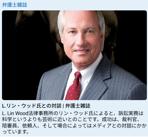 その結果、2011年に自身の法律事務所を再開しました。最初はブライアン・ケーブ法律事務所の同僚2名と共にウッド・ヘルナッキ・アンド・エバンス法律事務所として活動し、今年9月1日付けでL・リン・ウッド法律事務所に復帰し、ようやく円環を描いて戻ってきました。ジョナサン・グランバーグ法律事務所とデビッド・エーリッヒ法律事務所のアソシエイトが加わり、成長の糧となるチームを築けることを大変嬉しく思っています。この訴訟専門事務所は、個人訴訟であれ企業訴訟であれ、高額訴訟を扱っています。ウッド法律事務所は、彼らの専門分野を冗談交じりに「奇妙な訴訟」と呼んでいます。主な業務分野は、名誉毀損訴訟や、世論の裁判所への対応を含む憲法修正第1条関連訴訟、虚偽請求法関連訴訟、そして一般的な企業訴訟です。