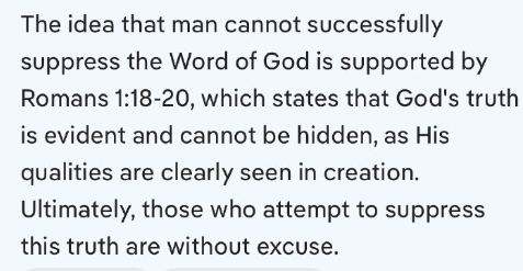人間が神の言葉をうまく抑圧できないという考えは、ローマ人への手紙1章18-20節によって裏付けられています。そこには、神の真理は明白であり、隠すことのできないものであると記されています。それは、神の特質が被造物に明確に表れているからです。