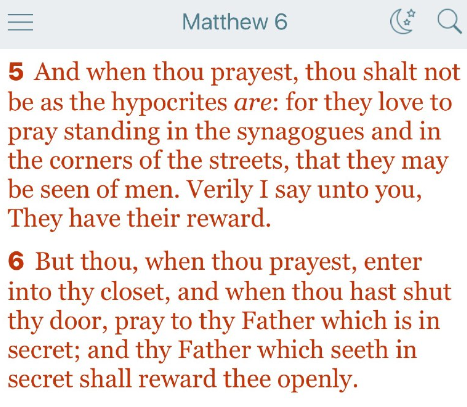 6 しかし、あなたは祈るときは、自分の奥まった部屋に入り、戸を閉じて、隠れたところにおられるあなたの父に祈りなさい。そうすれば、隠れた所で見ておられるあなたの父は、報いを与えてくださいます。