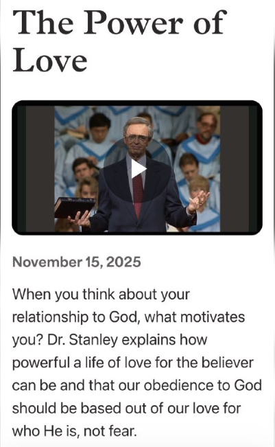 スタンリー博士は、信者への愛に満ちた人生がどれほど力強いものとなり得るか、そして神への従順は恐れではなく、神の存在への愛に基づくべきであることを説きます。